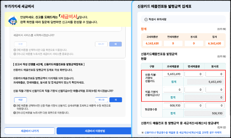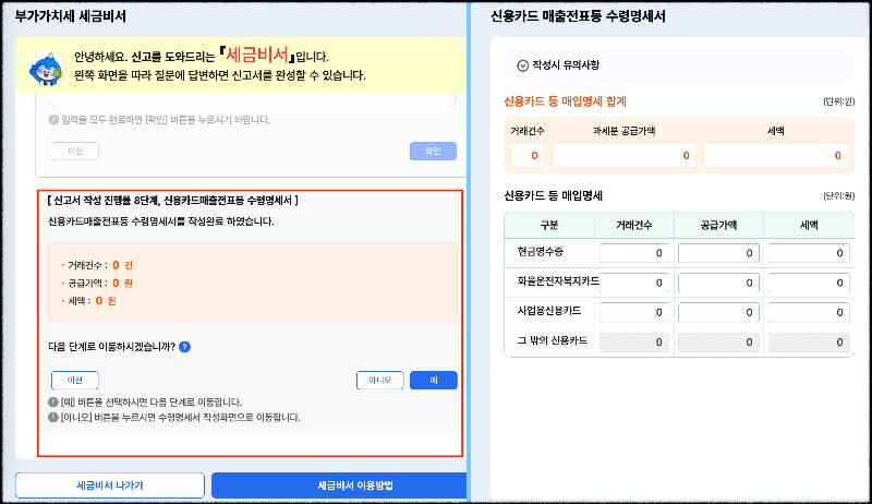 저는 사업자 카드가 없어 매입금액은 수기로 작성을 했지만 사업자 카드가 있다면 매입금액도 자동으로 입력이 됩니다.