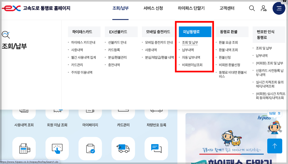 아래와 같이, 홈페이지 상단 메뉴에서 "조회 납부"를 클릭하고, "미납통행료"를 선택합니다.