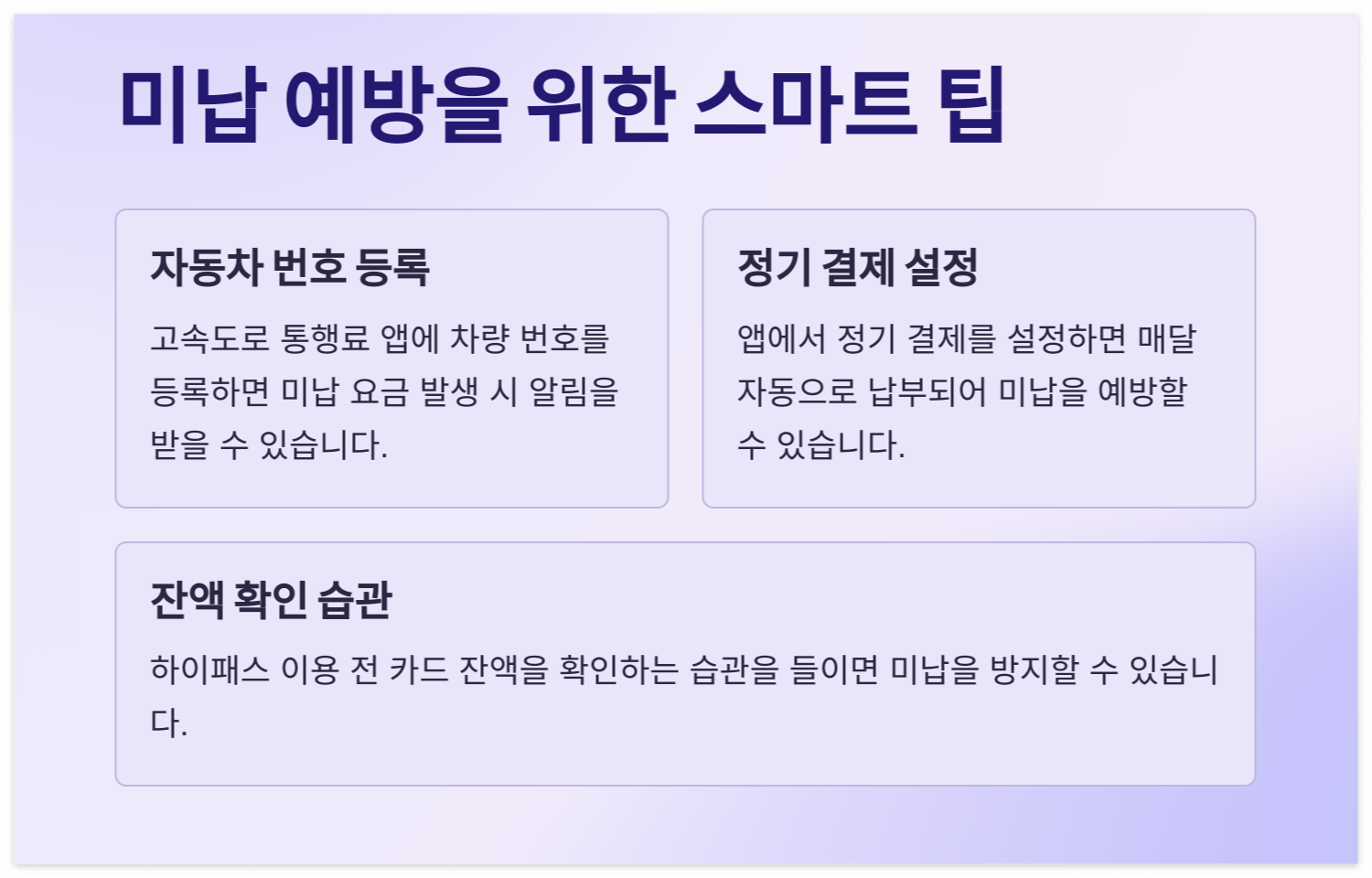 정기 결제: 고속도로 통행료 앱에서 정기 결제를 설정하면 매달 자동으로 납부되어 미납을 예방할 수 있습니다.