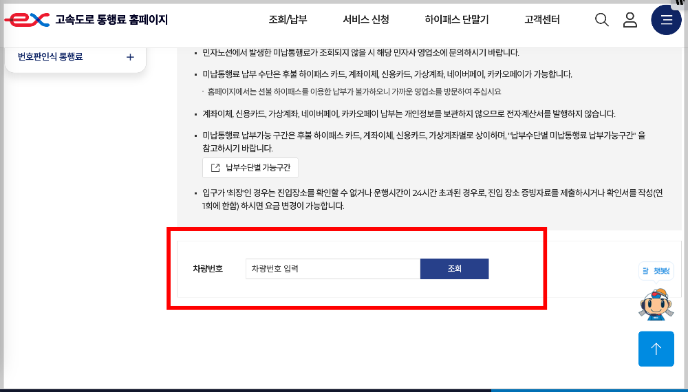 편의점 : CU, GS25 편의점에서 미납 통행료를 조회하고 현금 또는 카드로 납부할 수 있습니다.