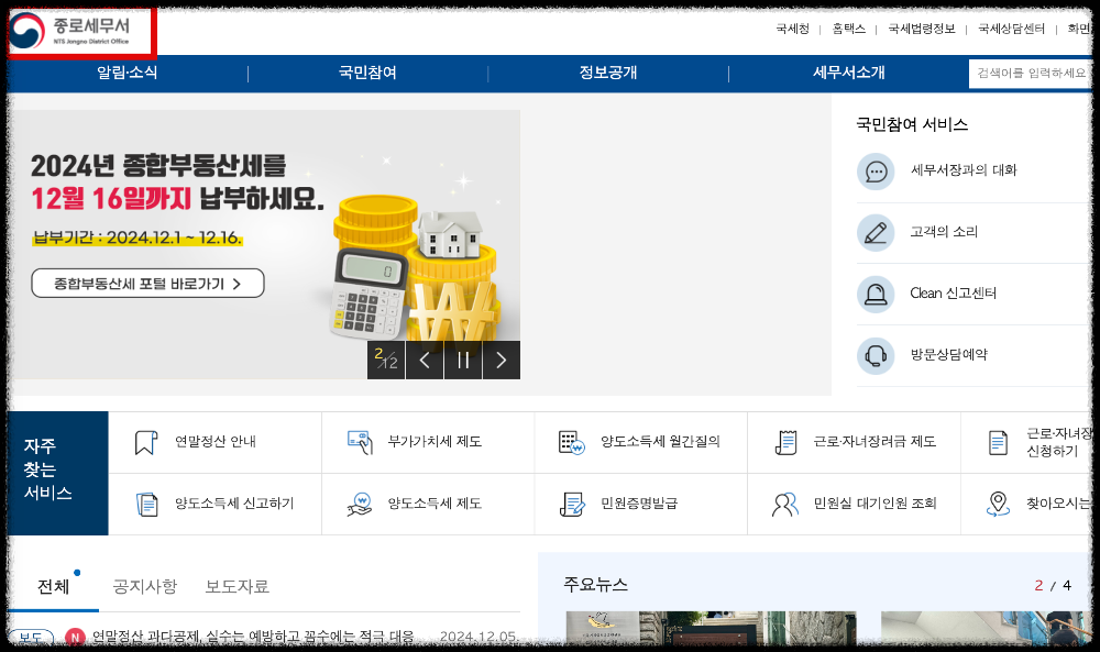 예를 들어 "서울"을 클릭하고 "종로"를 클릭하면, 아래와 같이 종로 세무서로 이동할 수 있습니다.