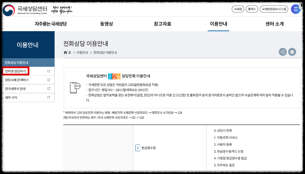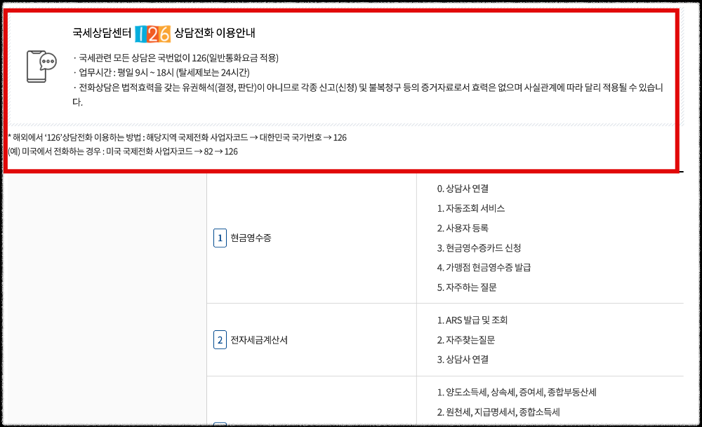 국세상담센터 번호는 "126"이며, 고객센터 운영시간은 평일 오전 9시~오후 6시까지이며, 해외 거주자라면 해당나라 번호를 누르고 126번을 누르면 됩니다.