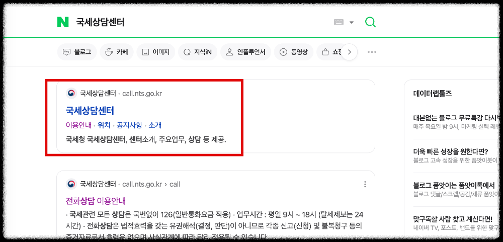 또 다른 방법은 포털사이트에서 "국세상담센터"를 검색한 후 접속하는 방법도 있습니다.