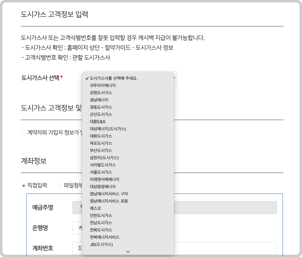 정보는 도시가스 고객정보와 입금받을 계좌번호를 입력해야 하니, 미리 확인하여 가입하면 빠를 것 같습니다.
