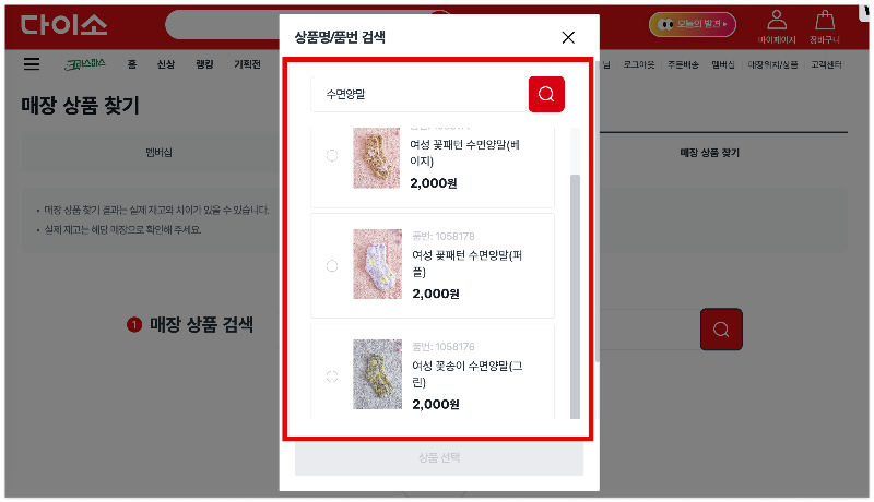 수면양말이 들어가는 모든 제품들을 확인할 수 있고 이 목록에서 원하는 제품을 선택하면 됩니다.
