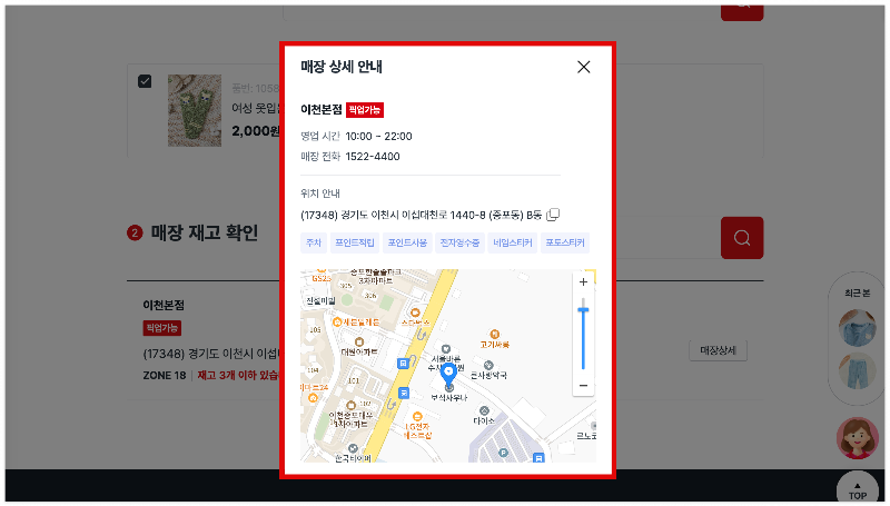 원하는 매장을 선택 후 재고가 있는지 아래와 같이 확인해 주세요.