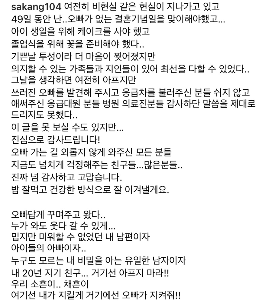 다만, 사강이 남편 사망 이후 SNS를 통해 심경을 밝힌 내용을 보면 건강상의 이유로 갑작스럽게 떠난 것이 아닐까 싶습니다.