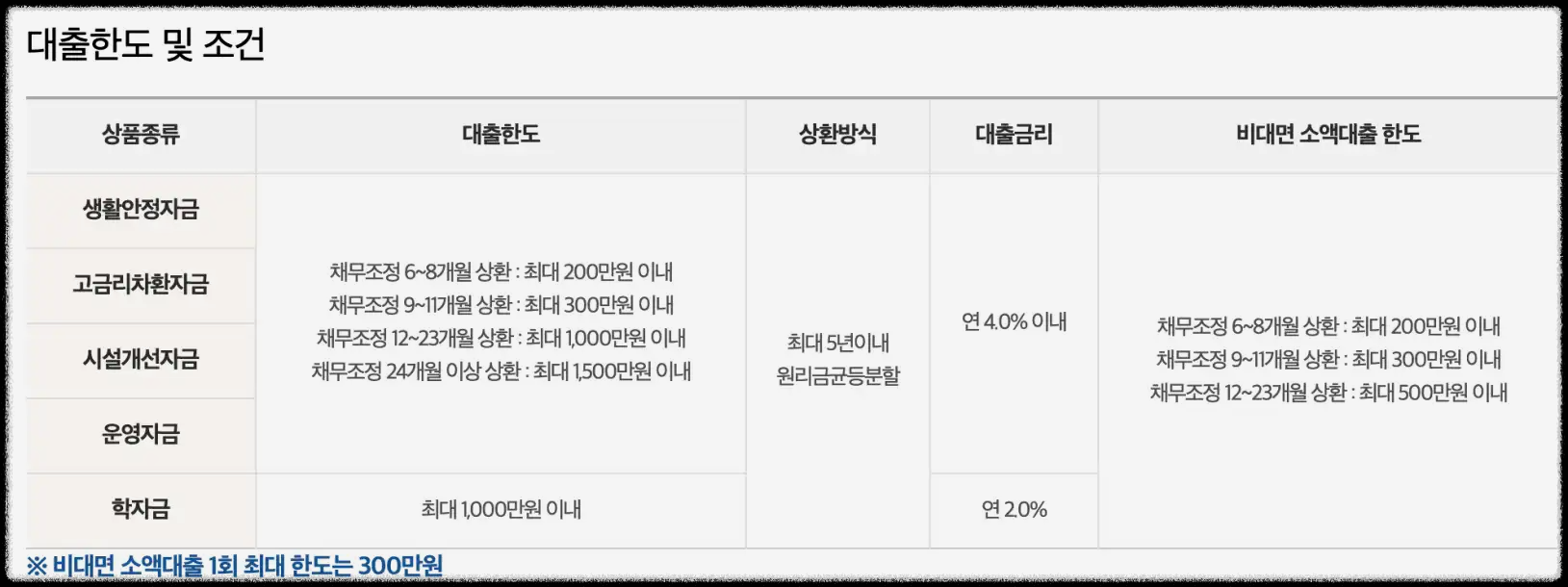 | ✔ 상환 기간 | 최근 6개월 이상 성실하게 상환 중이거나 최근 3년 이내 상환을 완료하신 분 |