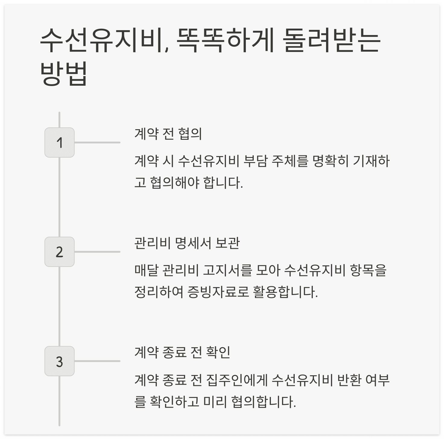 - 계약이 끝나기 전 집주인에게 수선유지비 반환 여부를 확인