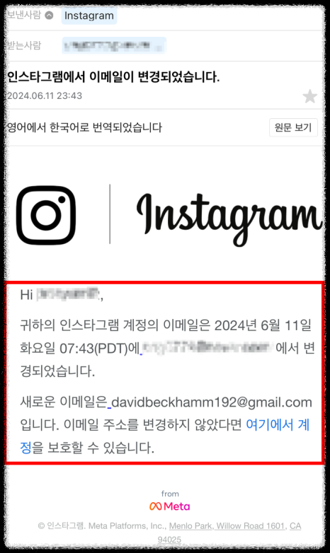 보낸 사람을 확인하지 않으면 인스타그램에서 온 것처럼 보일 수 있으니 꼭 보낸 사람을 확인하세요.