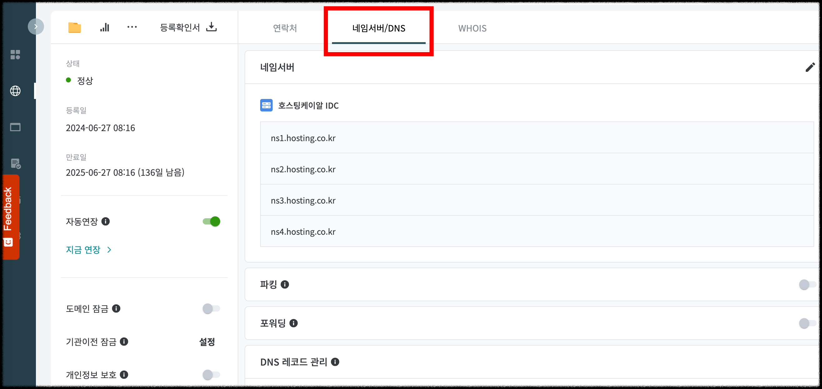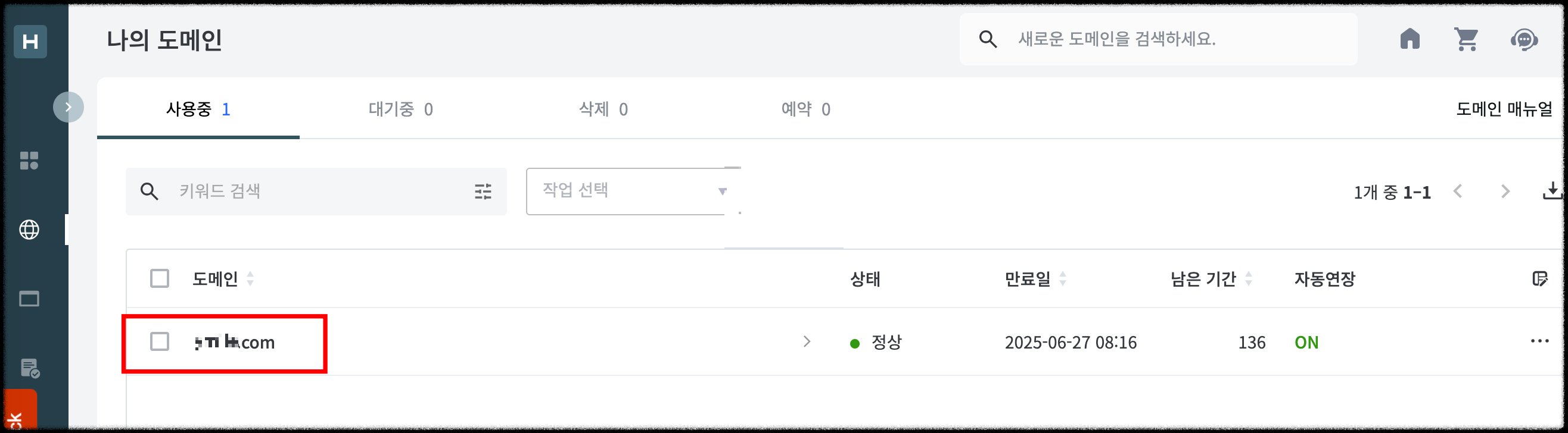 1. 호스팅케이알에 접속하여 로그인 후 - 나의 서비스 - 도메인을 클릭합니다.