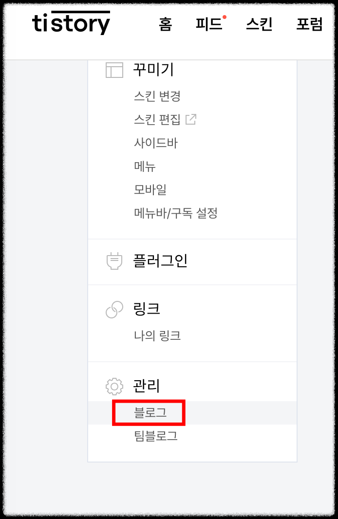 6. 이제 티스토리로 가서, 관리 - 블로그를 클릭합니다.
