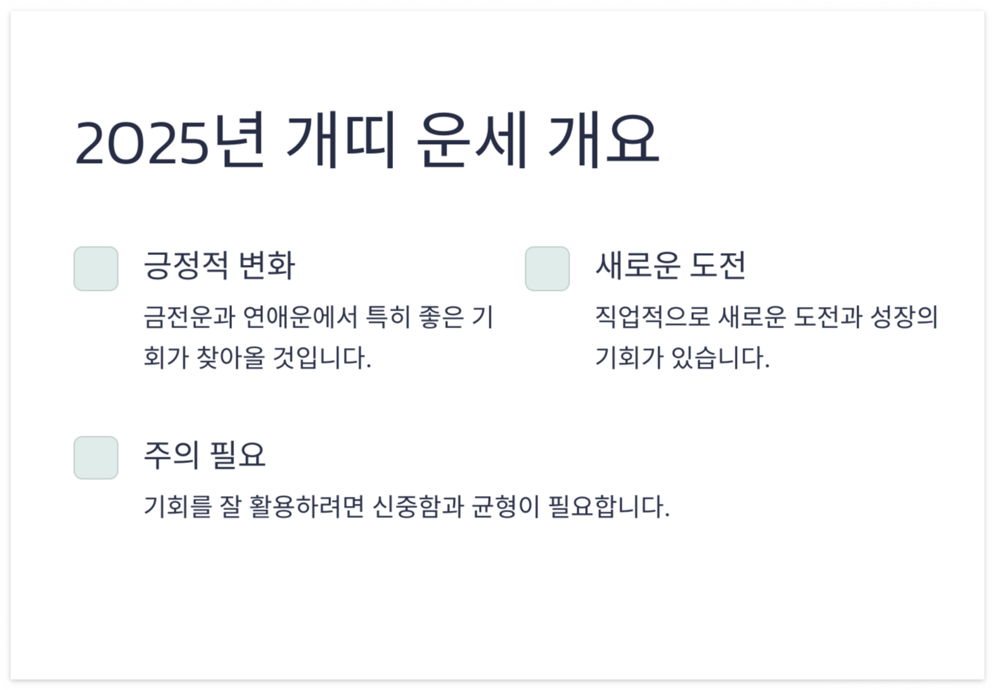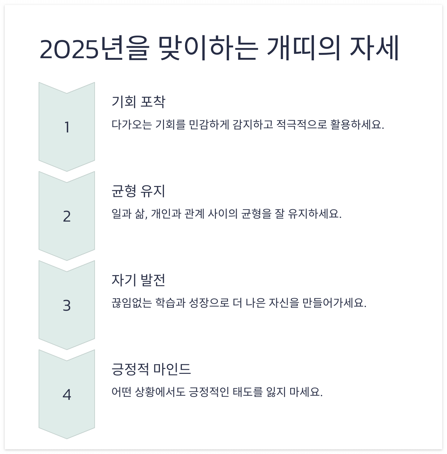2025년은 개띠에게 많은 기회가 주어지는 해입니다. 특히, 금전운과 연애운에서 긍정적인 변화가 예상되며, 직업적으로도 새로운 도전이 가능할 것입니다. 하지만 이러한 기회를 잘 활용하기 위해서는 주의해야 할 점도 많습니다.