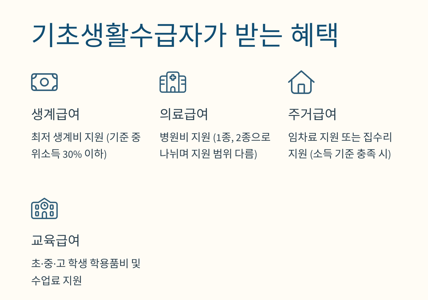 | 생계급여 | 최저 생계비 지원 (기준 중위소득 30% 이하) |