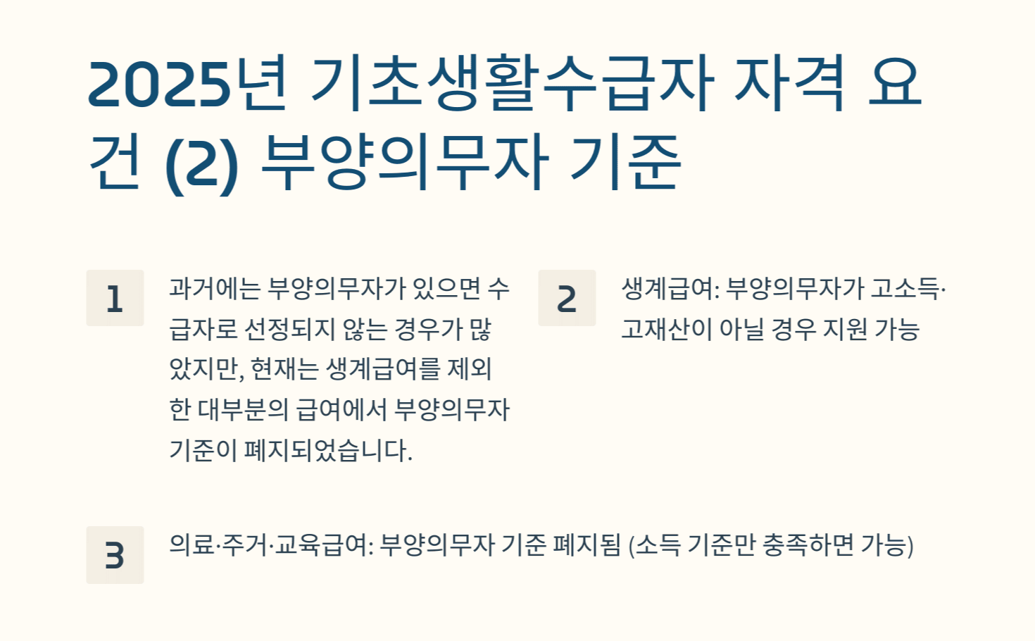 ✔ 의료·주거·교육급여: 부양의무자 기준 폐지됨 (소득 기준만 충족하면 가능)