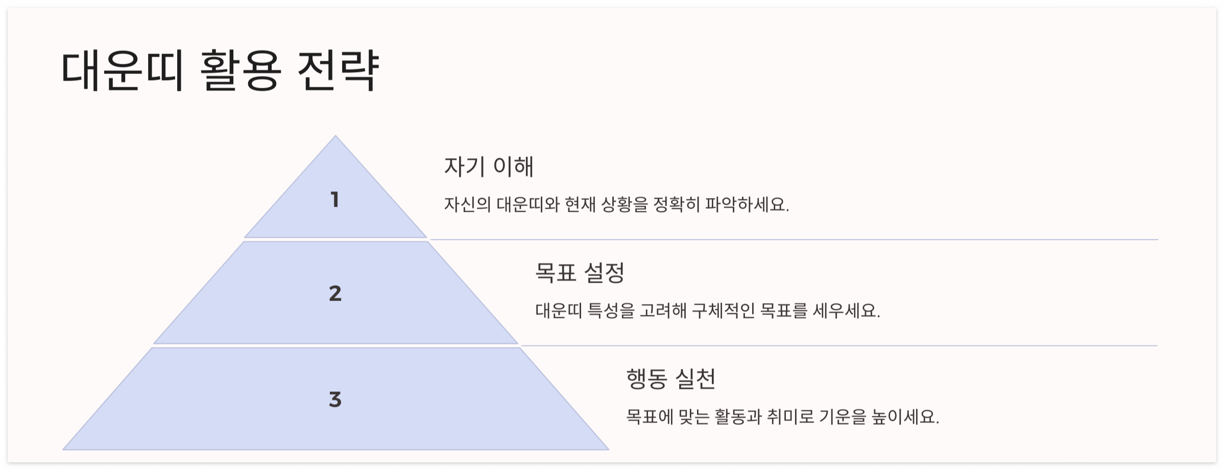 대운띠를 활용하기 위해서는 자신이 처한 상황을 정확하게 파악하는 게 중요합니다. 예를 들어, 자신의 대운띠와 매칭되는 띠의 특성을 이해하고, 이를 바탕으로 목표를 설정해 보세요. 또한, 대운띠에 맞는 취미나 활동을 통해 기운을 높이는 방법도 좋은 전략입니다.