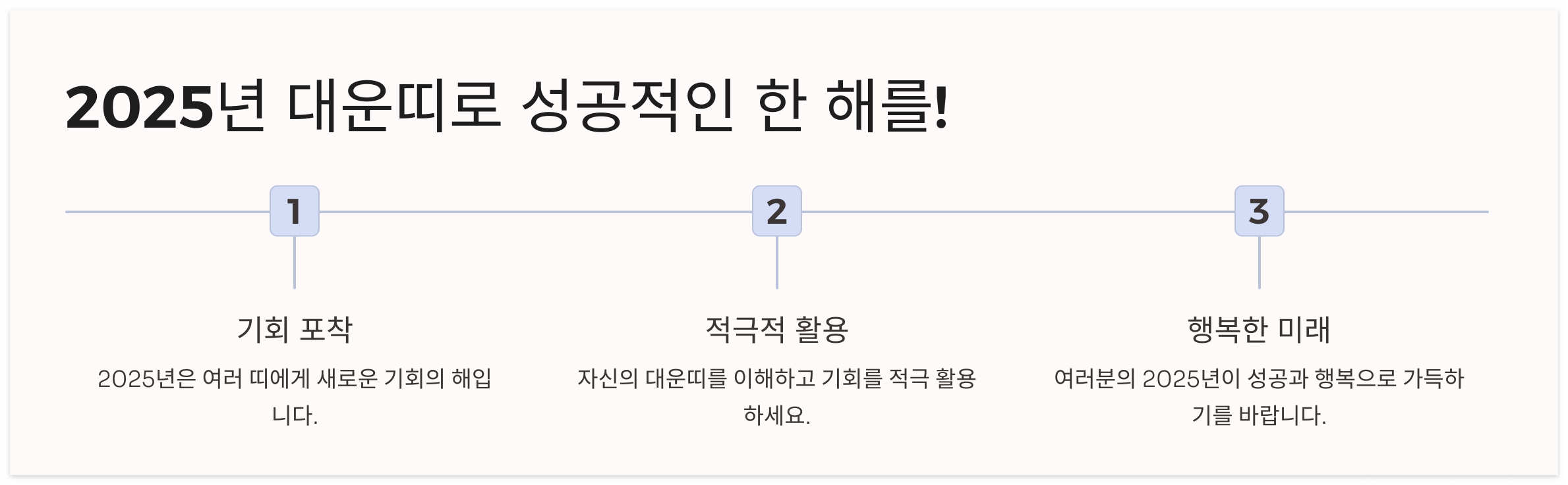 2025년은 여러 띠에게 새로운 기회와 변화가 예정되어 있는 해입니다. 특히 뱀띠, 원숭이띠, 닭띠는 좋은 운세를 기대할 수 있습니다. 자신의 대운띠를 이해하고, 이 기회를 적극적으로 활용한다면 더욱 풍요로운 한 해를 보낼 수 있을 것입니다. 여러분의 2025년이 행복과 성공이 가득하기를 바랍니다.
