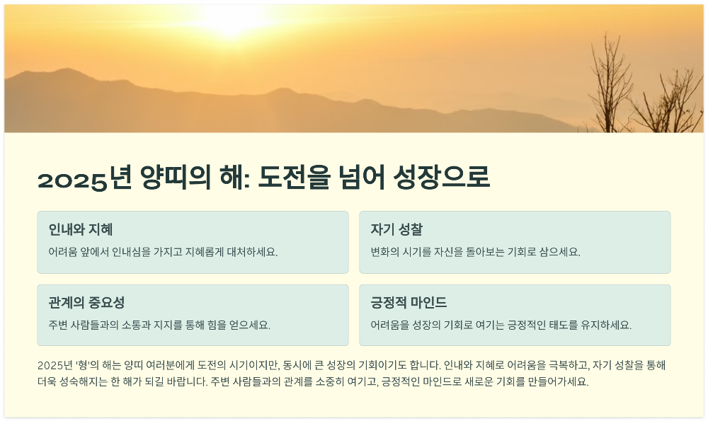 2025년, '형'의 해를 맞이한 양띠는 인내와 지혜를 통해 어려움을 극복하고 더욱 성숙해지는 한 해를 보내게 될 것입니다.
