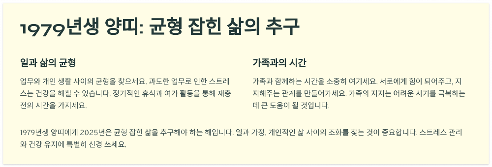 1979년 기미생 양띠에게 2025년은 균형 잡힌 삶을 추구하며 '형'의 해를 슬기롭게 극복해야 하는 한 해입니다. 일과 가정, 개인적인 삶 사이의 균형을 맞추는 것이 중요합니다.
